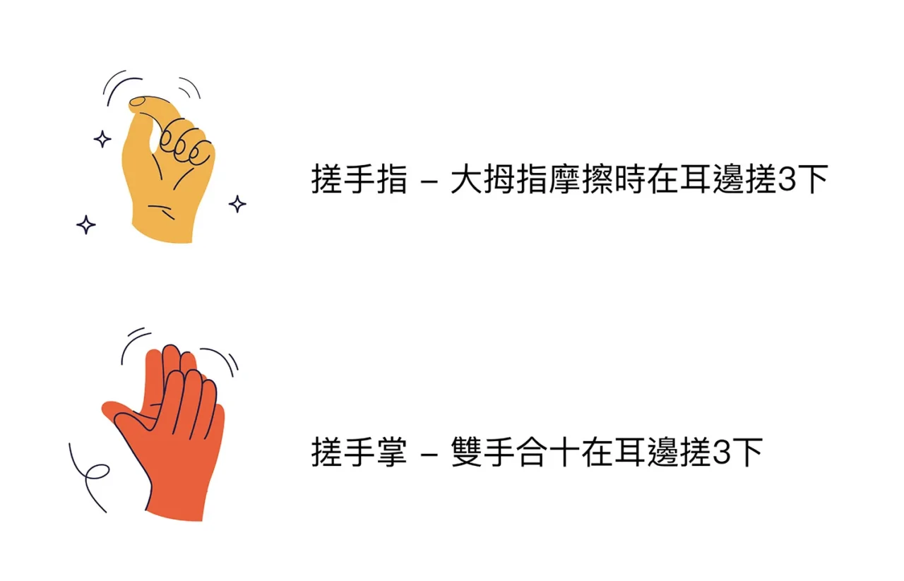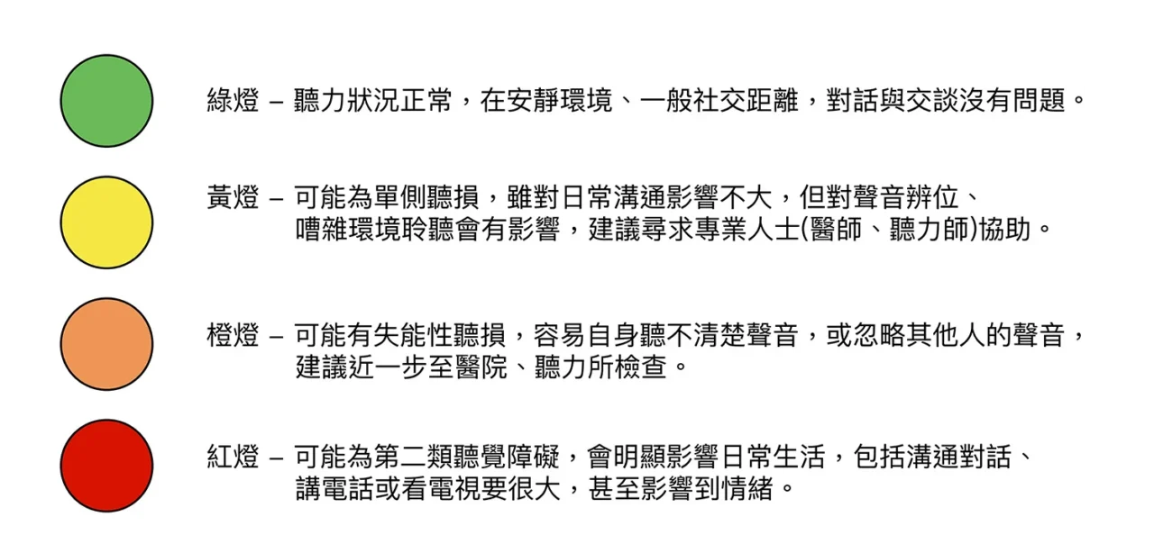 ★ 若兩隻都沒聽到搓手指和搓手掌的聲音,代表聽力狀況為:紅燈